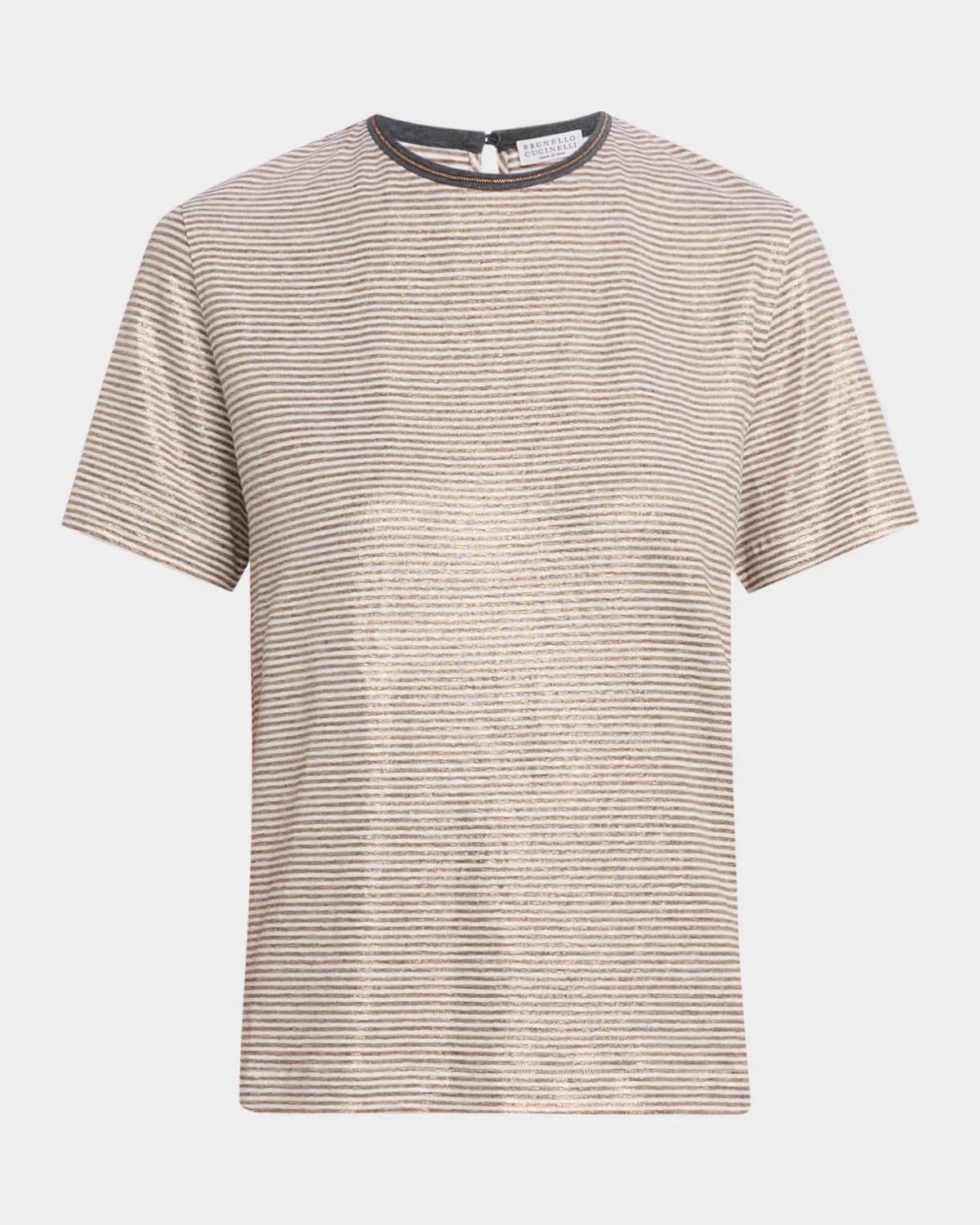 Crafted from shimmering striped linen stretch, this T-shirt from Brunello Cucinelli features a contrast collar embellished with monili trim Crew neckline; button/keyhole back Short sleeves Relaxed fit Hip length Pullover style Linen/elastane Dry clean Made in Italy SIZE & FITModel measurements: 5 & apos;10" tallModel is wearing a US size 4/Small