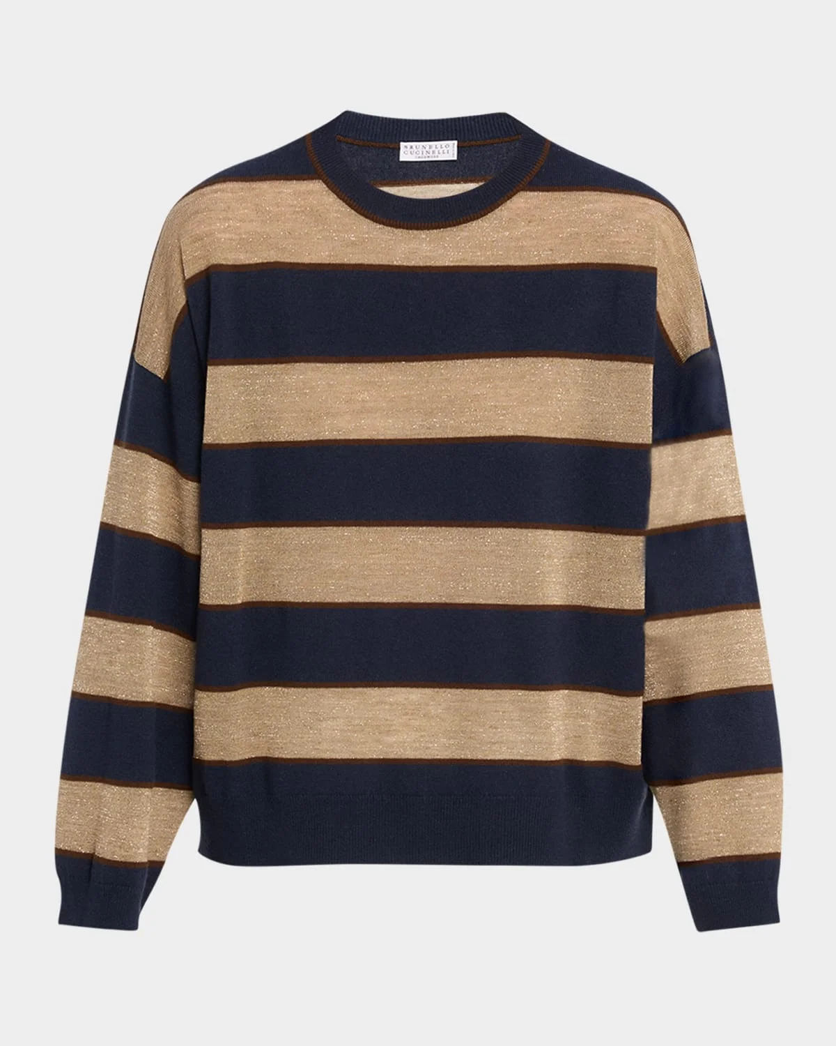 Crafted from lightweight wool-cashmere knit, this sweater from Brunello Cucinelli features a sparkling striped intarsia and a loose silhouette Crew neckline Long sleeves Drop shoulders Loose fit Hip length Ribbed cuffs and hem Pullover style Virgin wool/cashmere/silk Professional cleaning recommended Made in Italy SIZE & FITModel measurements: 5 & apos;10" tallModel is wearing a US size 4/Small