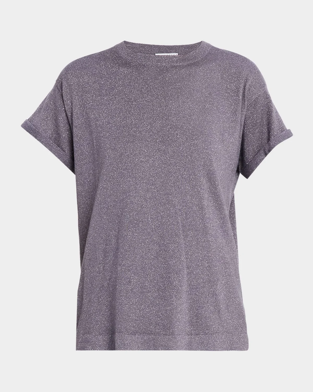 Brunello Cucinelli knit lurex shirt Crew neckline Short sleeves Relaxed fit Pullover style Cashmere/silk/nylon/polyamide Made in Italy