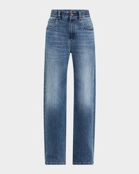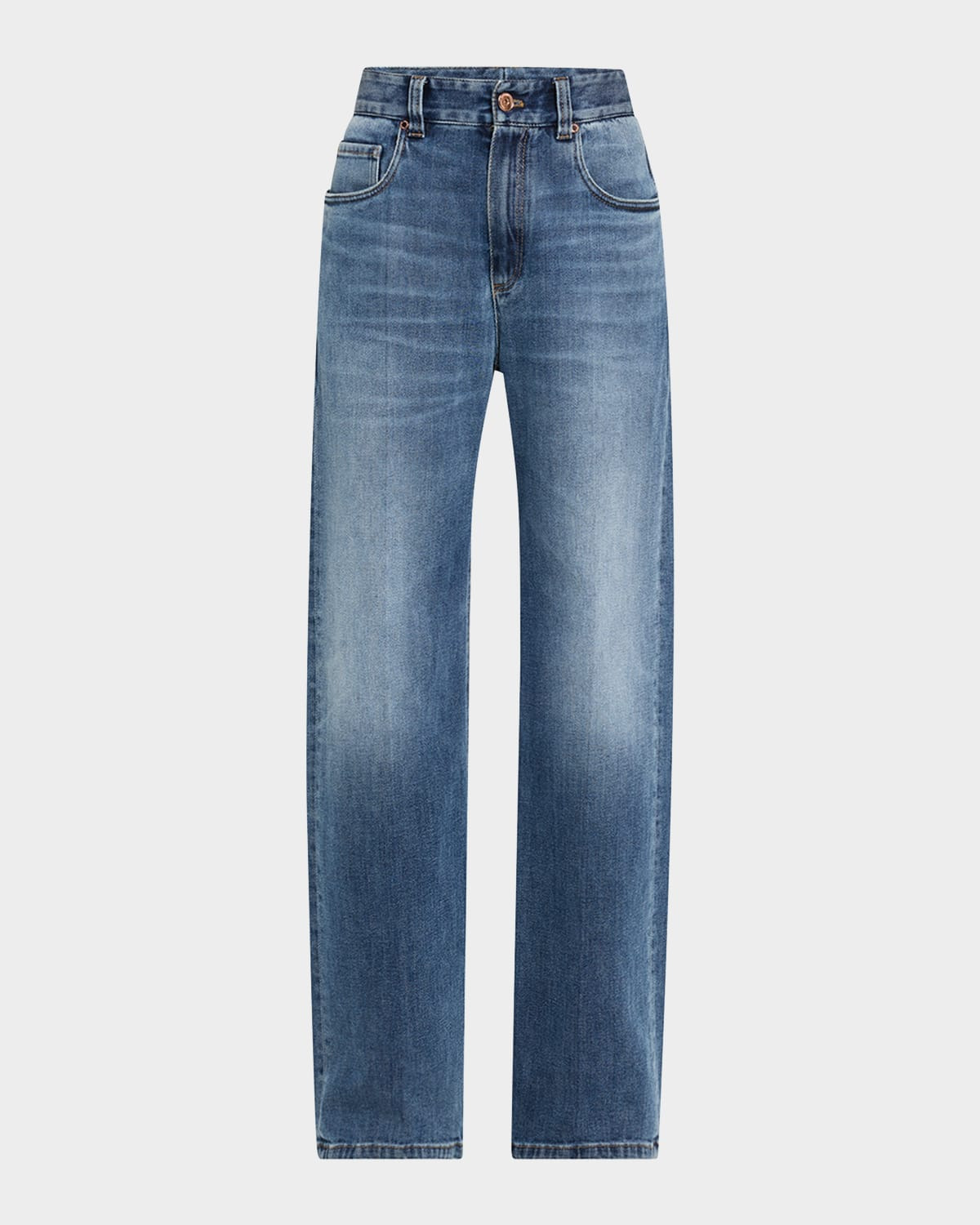 - Brunello Cucinelli soft denim stove pipe jeans fetauring fading, slight whiskering, and signature monili belt loop detail - High rise - Five-pocket style - Loose straight legs - Full length - Button/zip fly; belt loops - Cotton/elastane - Made in Italy