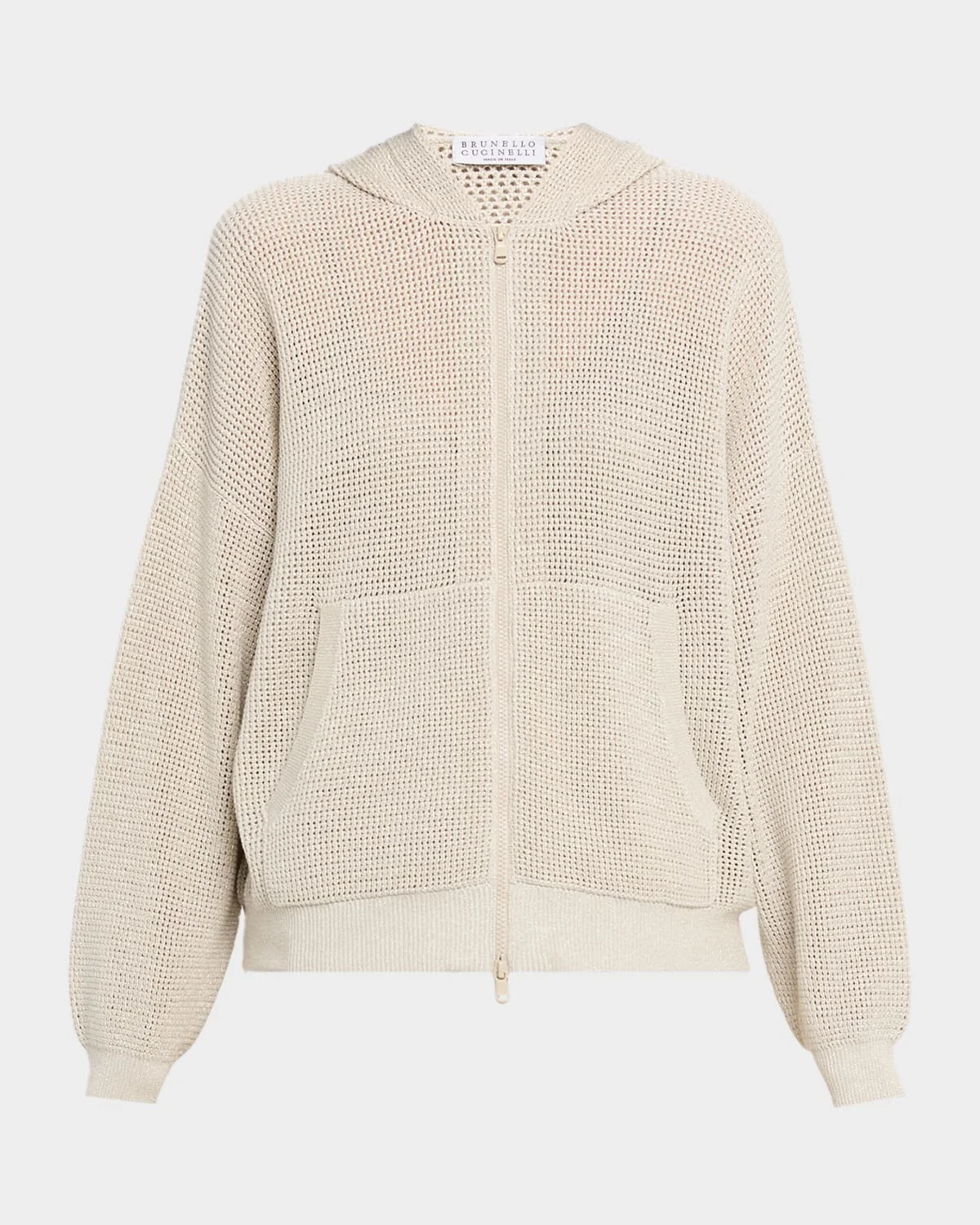 Crafted from sparkling cotton net knit, this hoodie from Brunello Cucinelli features an oversized silhouette Hooded neckline; two-way zip front Long sleeves Drop shoulders Front split kangaroo pocket Oversized fit Ribbed cuffs and hem Cotton/viscose/nylon/polyamide Dry clean Made in Italy