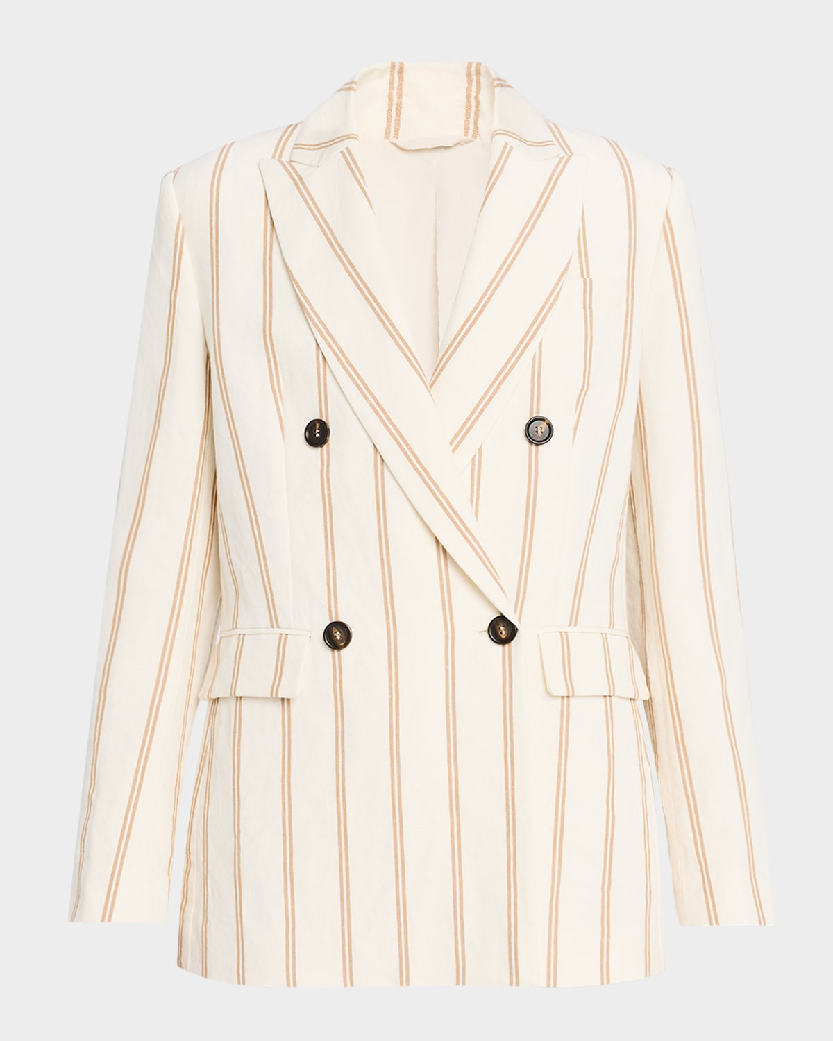 - Brunello Cucinelli structured blazer jacket featuring a striped motif - Peak lapels; double-breasted front - Long sleeves; button cuffs - Chest welt pocket; side flap pockets - Straight fit - Center-back vented hem - Linen/cotton - Made in Italy