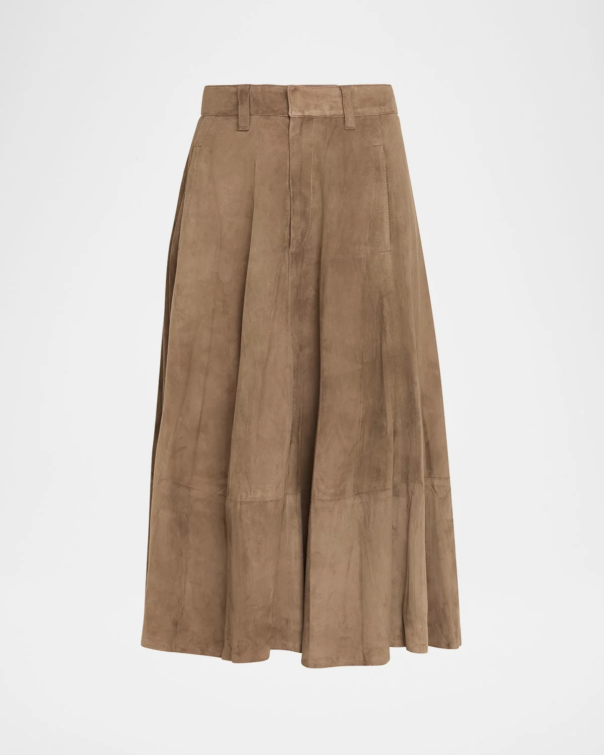 Brunello Cucinelli skirt is crafted of a flowy soft lamb suede High waist Hip welt pockets Hem falls below the knee Circle silhouette Hook/zip fly; belt loops Suede Lining: Acetate/polyester Dry clean Made in Italy