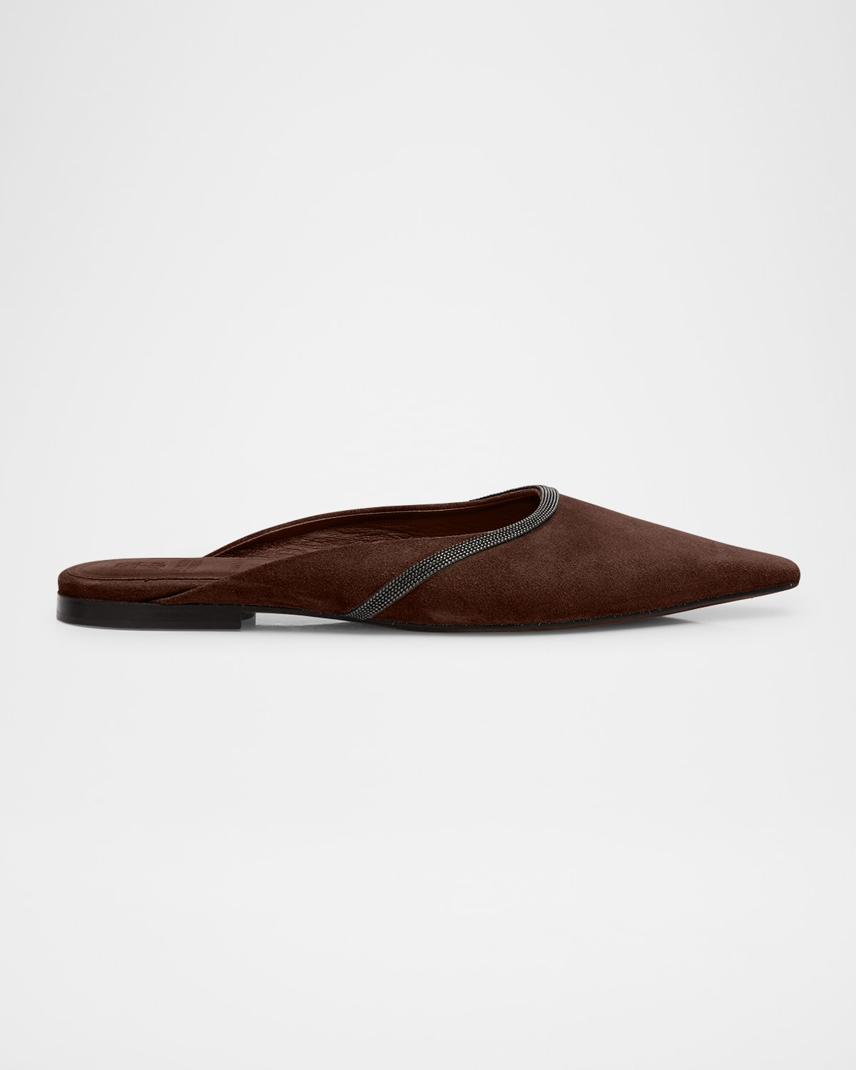 - Brunello Cucinelli soft calf suede ballerina mules with signature monili beading detail - Flat heel - Snipped, pointed toe - Slide style - Leather outsole - Lining: Leather - Professional cleaning recommended, spot clean - Made in Italy