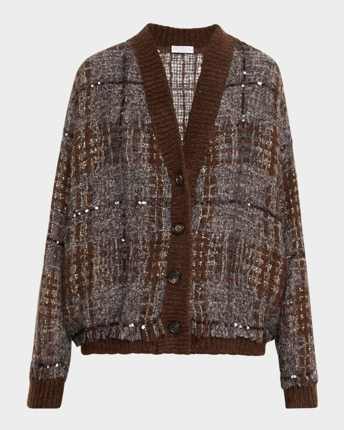 - Brunello Cucinelli knit organza cardigan in sequin-embellished tartan - Ribbed V neckline - Dropped shoulders - Long sleeves with ribbed cuffs - Relaxed fit - Ribbed hem - Button-front - Virgin wool/nylon/polyamide - Made in Italy