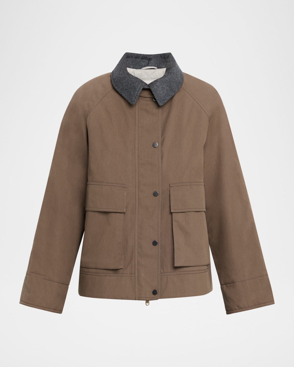 - Crafted from Techno cotton canvas, this jacket by Brunello Cucinelli features a dry hand with a slightly matte appearance - Contrasting wool collar - Long raglan sleeves - Front flap patch pockets - Relaxed fit - Mid-length - Front zip/snap placket - Virgin wool/cotton/nylon/polyamide - Lining: Nylon - Made in Italy