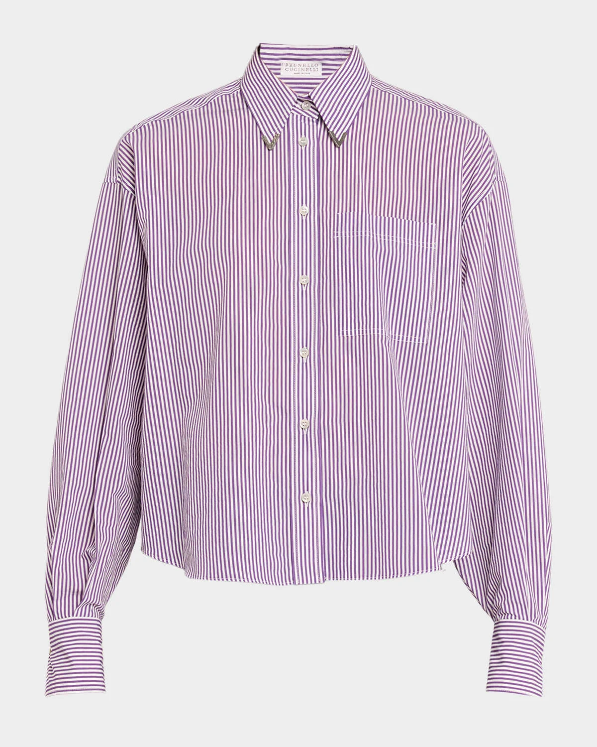 - A fresh take on the classic button-down, this Brunello Cucinelli top, crafted from a technical cotton, is elevated with brass trim along the collar. - Dropped shoulders - Long sleeves with button cuffs - Chest pocket - Classic fit - Hem falls to the hip - Button-front - Cotton/polyester - Dry clean - Made in Italy