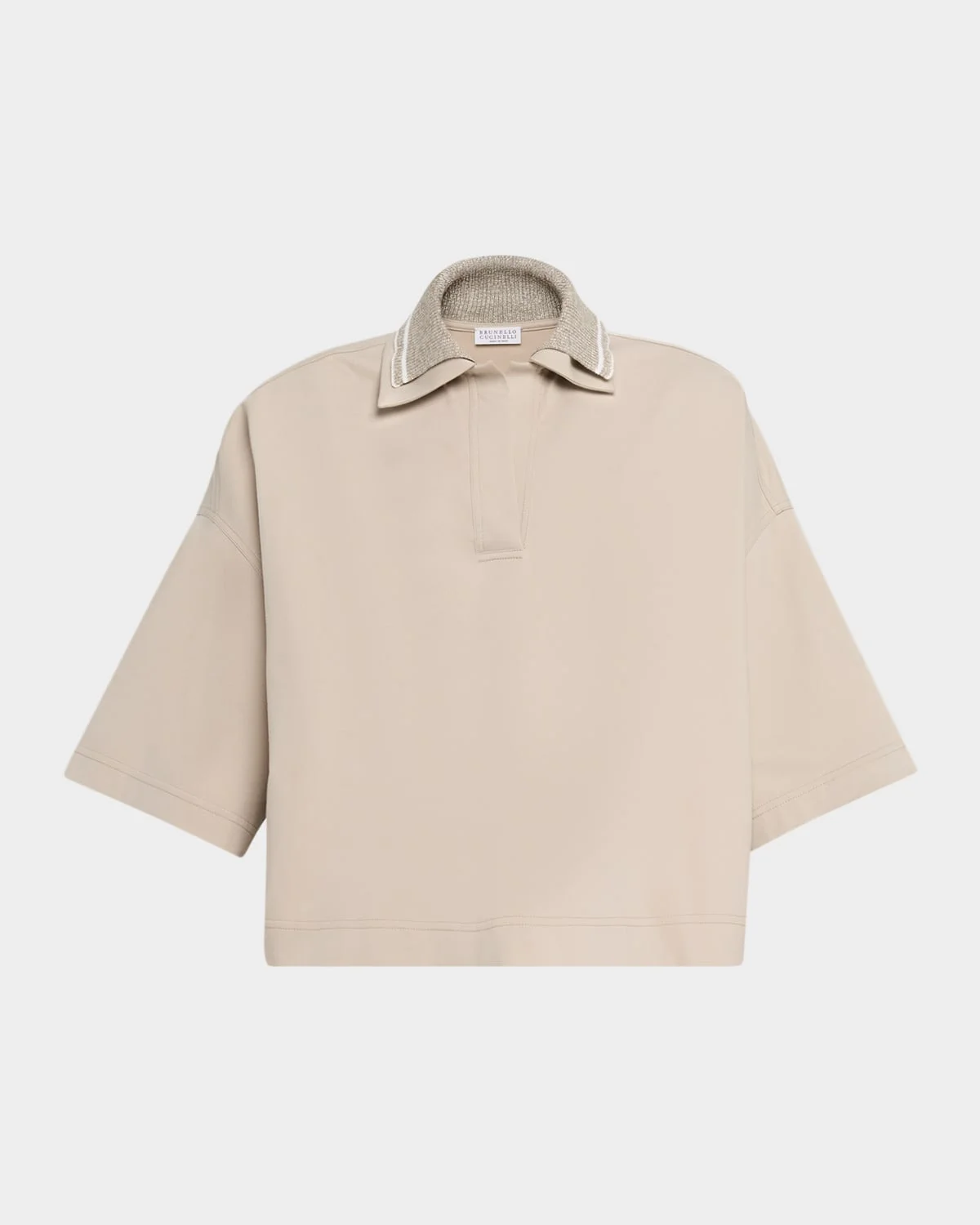 Brunello Cucinelli polo shirt is crafted of techno couture fleece featuring a double metallic knit collar detail Spread collar; split V front Short sleeves Drop shoulders Oversized fit Pullober style Cotton/linen/nylon/polyamide Dry clean Made in Italy