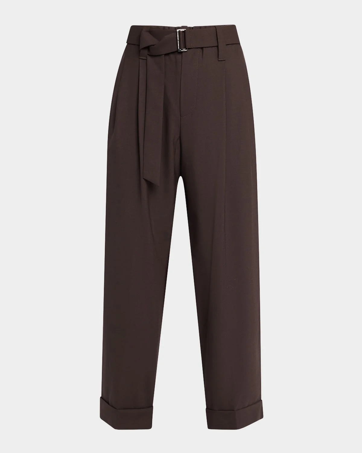 - Brunello Cucinelli baggy sartorial pants are outfitted with an adjustable buckle belt - Mid rise sits high on hip - Pleated front - Side slip pockets; back welt pockets - Cropped at the ankle - Straight legs - Virgin wool - Made in Italy