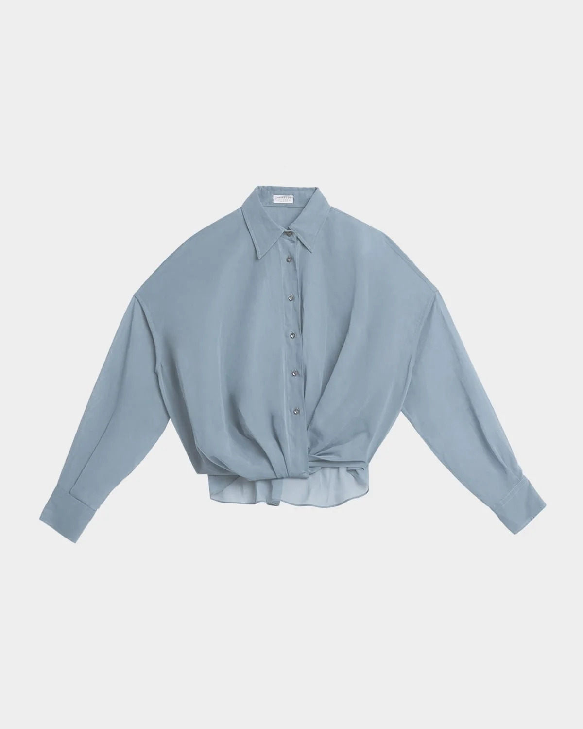 Brunello Cucinelli shirt is crafted of sheer cotton featuring a twisted hem detail Point collar; button front Long sleeves; button cuffs Yoked back; box pleat Loose fit Hip length Shirttail back hem Cotton Made in Italy