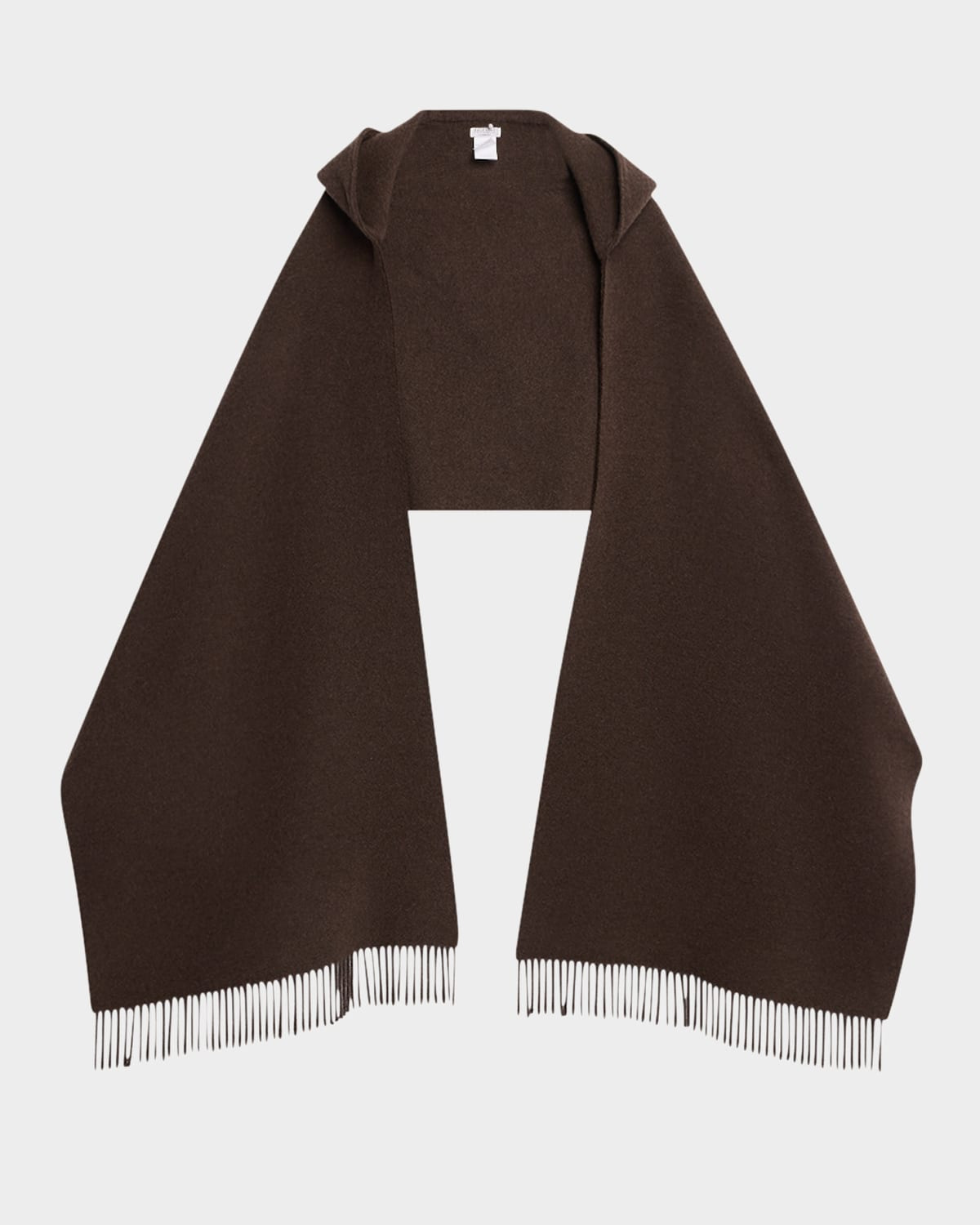 - Brunello Cucinelli cape scarf featuring a hood - Fringe ends - May be styled multiple ways - Wool/cashmere - Made in Italy