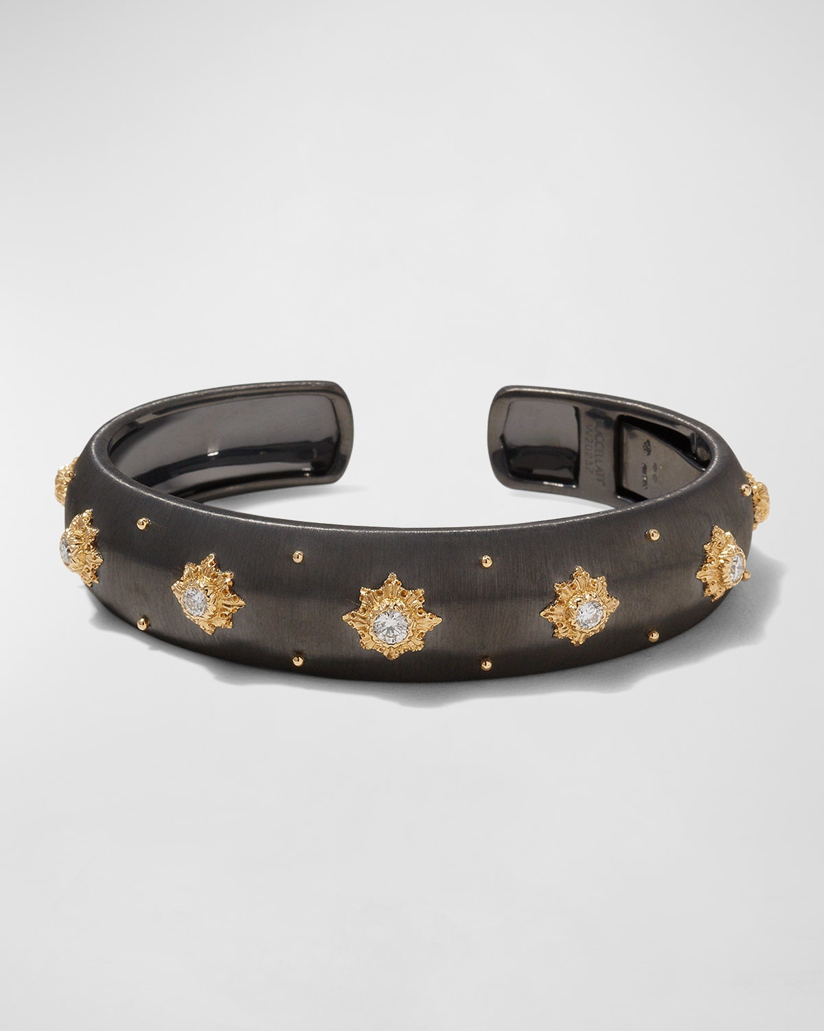 - Macri cuff bracelet from Buccellati - Polished 18-karat gold hardware - Brushed yellow gold split cuff - Round diamonds in white gold - 0.75 total diamond carat weight - Approx. 0.6"W (15mm) - Split opening eases dress
