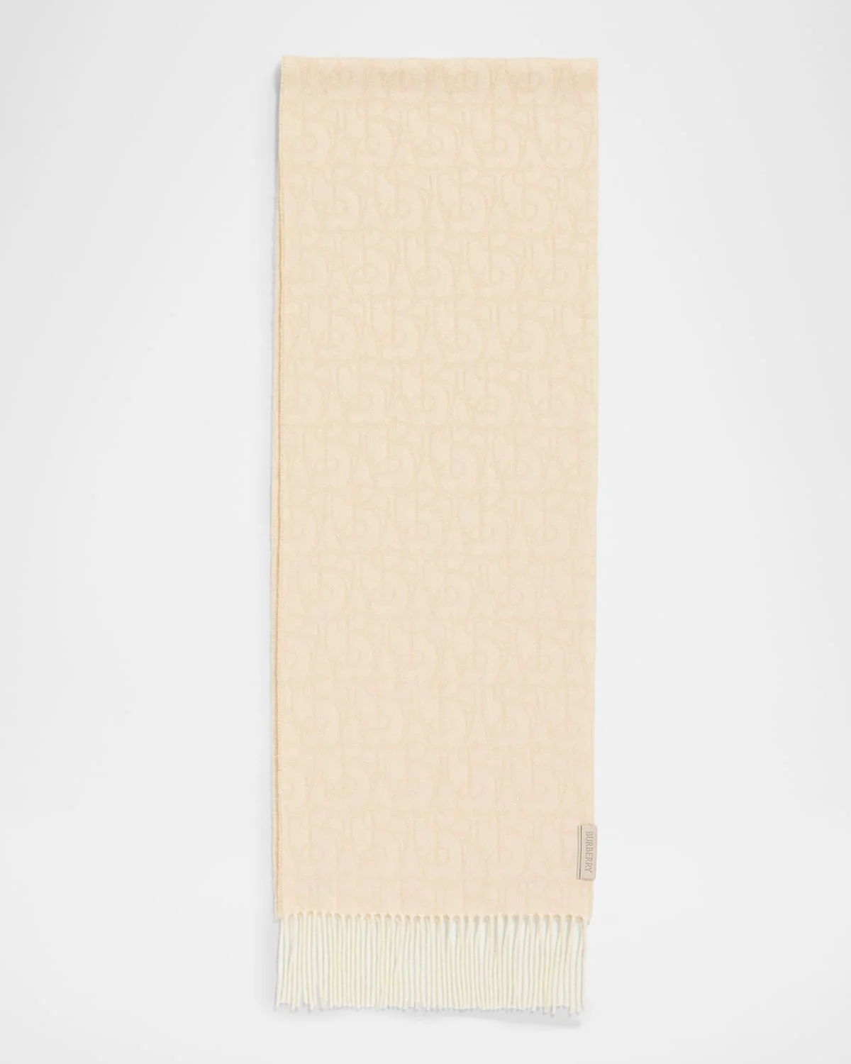 Burberry scarf, jacquardwoven with a B charm pattern. A Suede tag with embossed logo lettering at the side completes this ultrasoft style. Approx. 66"L x 12.0"W May be styled multiple ways Cashmere/leather Professional cleaning recommended Trim: Suede Imported