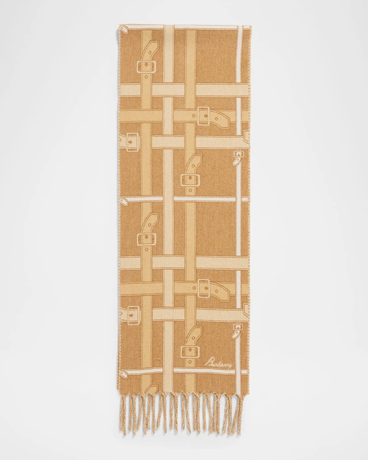 Crafted from cashmere in Italy, this Burberry scarf showcases an archival design jacquardwoven alongside the brand's lettering. The pattern cleverly reimagines the trench coat belt as the iconic check. Approx. 75"L x 12"W Rectangular Fringing at both ends Can be styled multiple ways Cashmere Made in Italy