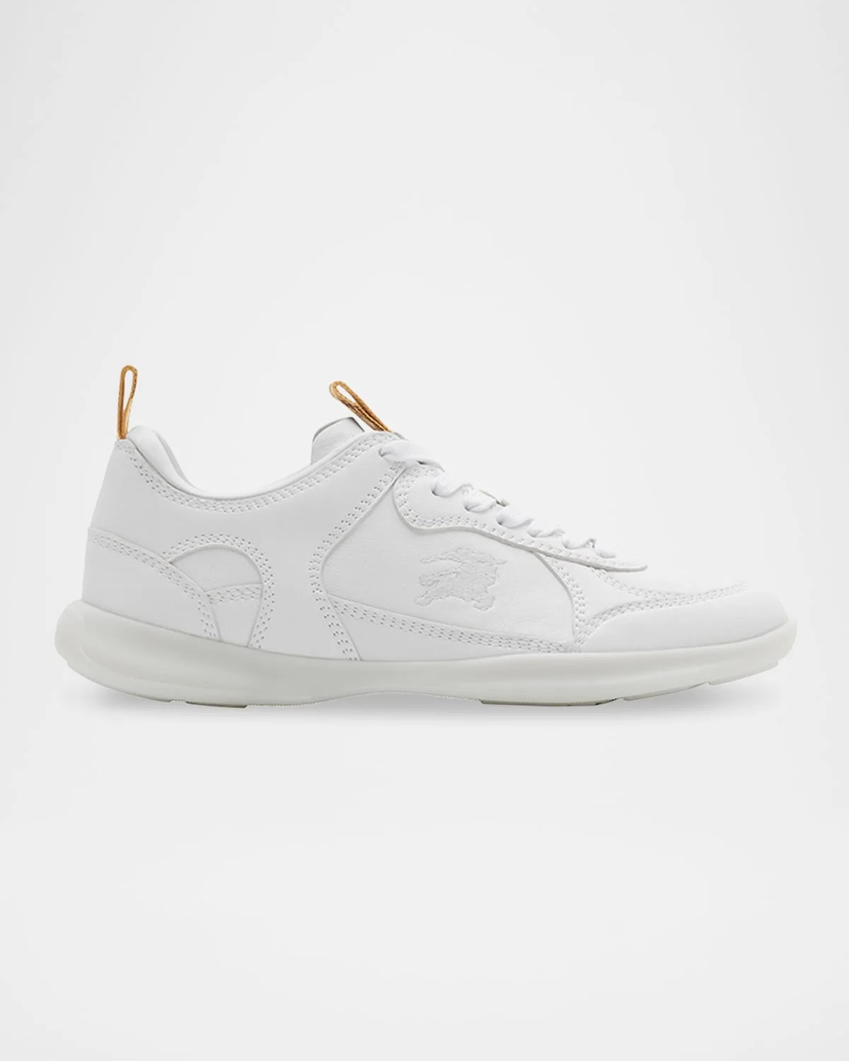 - Burberry "Blade" lambskin leather trainer sneakers with tonal topstitching inspired by sports styles - Features signature embroidered equestrian knight design on sides - Flat heel - Round toe - Lace-up vamp - Check pull-tab on tongue and backstay - Lining: leather/polyester/polyurethane/leather - Trim: polyester/nylon - Lightweight, sturdy TPU outsole - Made in Italy