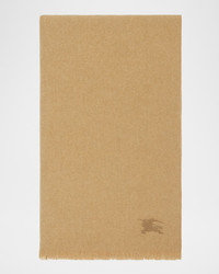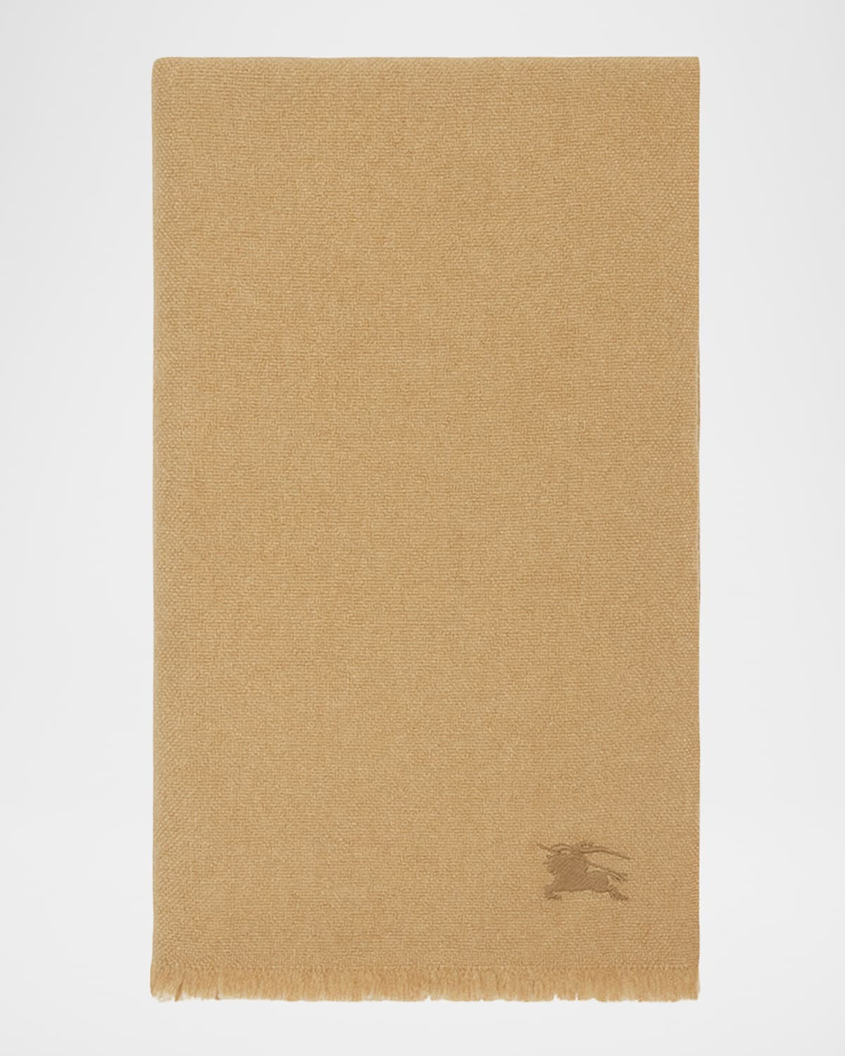 - Burberry woven cashmere scarf embroidered with the classic equestrian knight design - Approx. 70.9"L x 20.9"W - Eyelash trim - Can be styled in multiple ways - Cashmere/silk - Professional cleaning recommended - Made in Italy