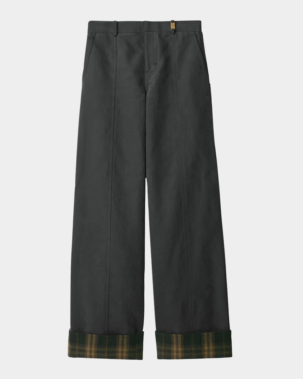 Burberry trousers featuring logo belt loop detail, center seams, and a rolled cuff with a signature check motif Mid rise sits high on hip Angled side slip pockets; back patch pockets Wide legs Full length Hook/zip fly; belt loops Wool/cupro Made in Italy