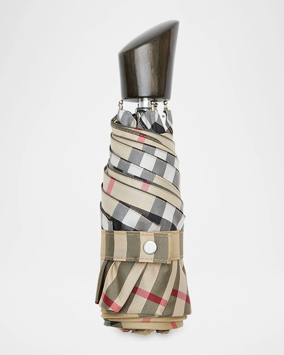 This compact folding umbrella from Burberry is woven with the house & apos;s iconic check pattern. A smooth wooden handle & nbsp;and metal cap engraved with the Equestrian Knight Design complete this practical piece. Approx. 23.2" length; 9.1" folded length; 39.4" diameter Press-stud closure Comes with a matching zip pouch Polyester Handle: maple wood Frame: iron/ aluminium Imported