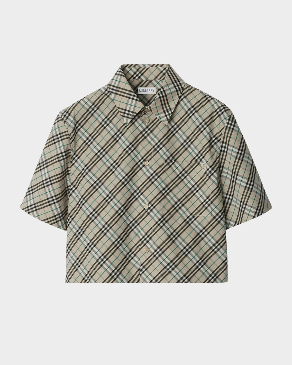 - Burberry shirt featuring a signature check print and monogram shield embroidered chest - Point collar; button front - Short sleeves - Chest patch pocket - Boxy fit - Cropped length - Cotton - Made in Italy