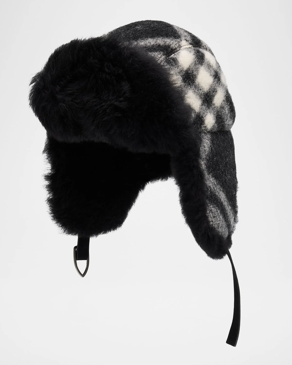 Crafted of wool woven with a seasonal Burberry Check pattern, this padded trapper hat is trimmed with soft dyed shearling (Spain) on the front and side panels. Adjustable chin strap with buckle closure Pressstud front panel Ear flaps Lining: cotton Filling: polyester Professional cleaning recommended Made in Italy