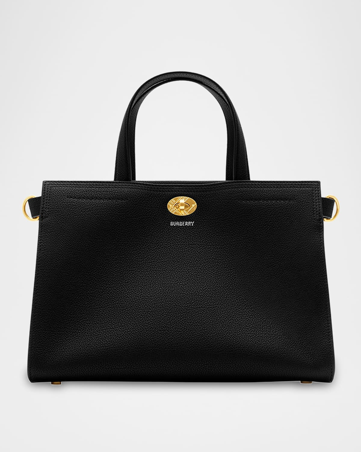 - A timeless tote made in Italy from grainy calf leather, lined in a cotton blend woven with the Burberry check. The spacious design is detailed with a check-engraved closure and d-ring hardware inspired by the belt from their iconic trench coats. Carry in hand or as a shoulder bag using the strap. - Burberry "Cotswolds" tote bag in grainy calf leather - Top handles - Detachable, adjustable shoulder strap - Can be worn as a top handle or shoulder/crossbody bag - Open top with twist-lock closure - Side adjusters - Interior, zip pocket - Hand-painted edges - Brushed metal hardware - Embossed Burberry lettering at fron - Comes with a dust bag - Lining: Check cotton - Feet protect bottom of bag - Approx. 8.9"H x 12"W x 5.1"D - Made in Italy