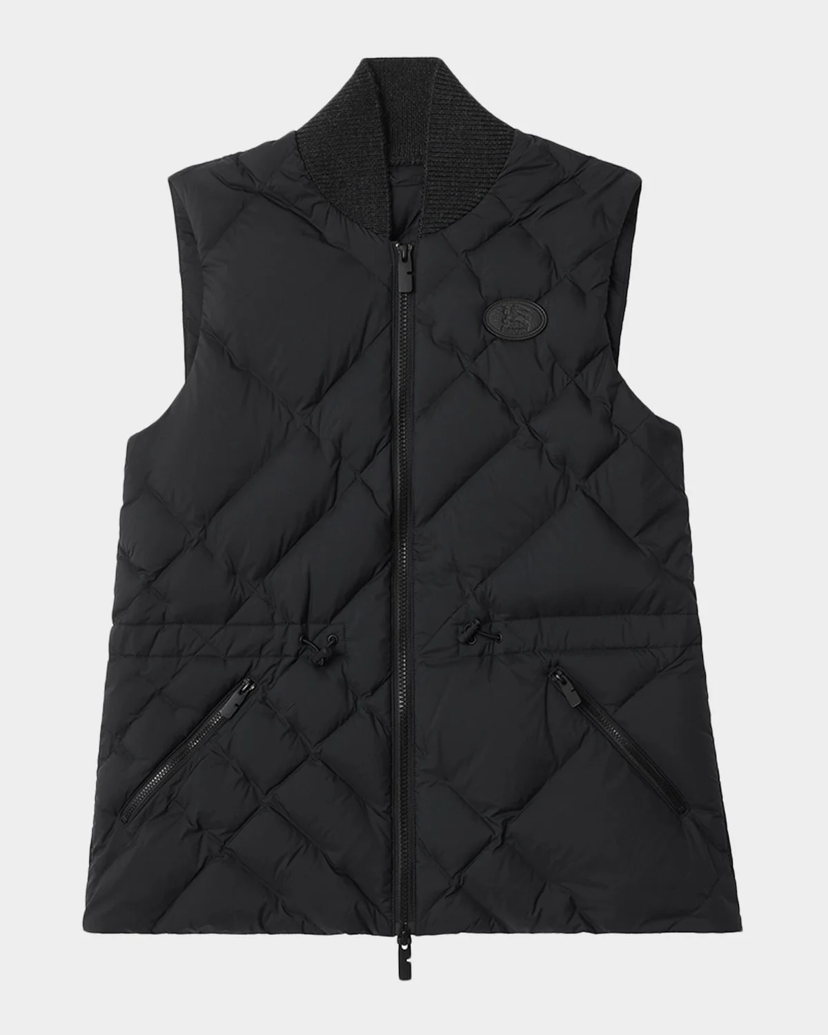 Burberry "Devonside" quilted vest is crafted of a technical nylon featuring a signature EKD embossed lambskin leather patch on the chest and wool ribbed knit trim Baseball collar; twoway zip front Sleeveless Inner drawcord cinched waist Hip zip pockets Straight fit Hip length Nylon/polyamide/wool/elastane Lining: Nylon Fill: Polyester/feather/down Trim: Leather Machine wash Imported