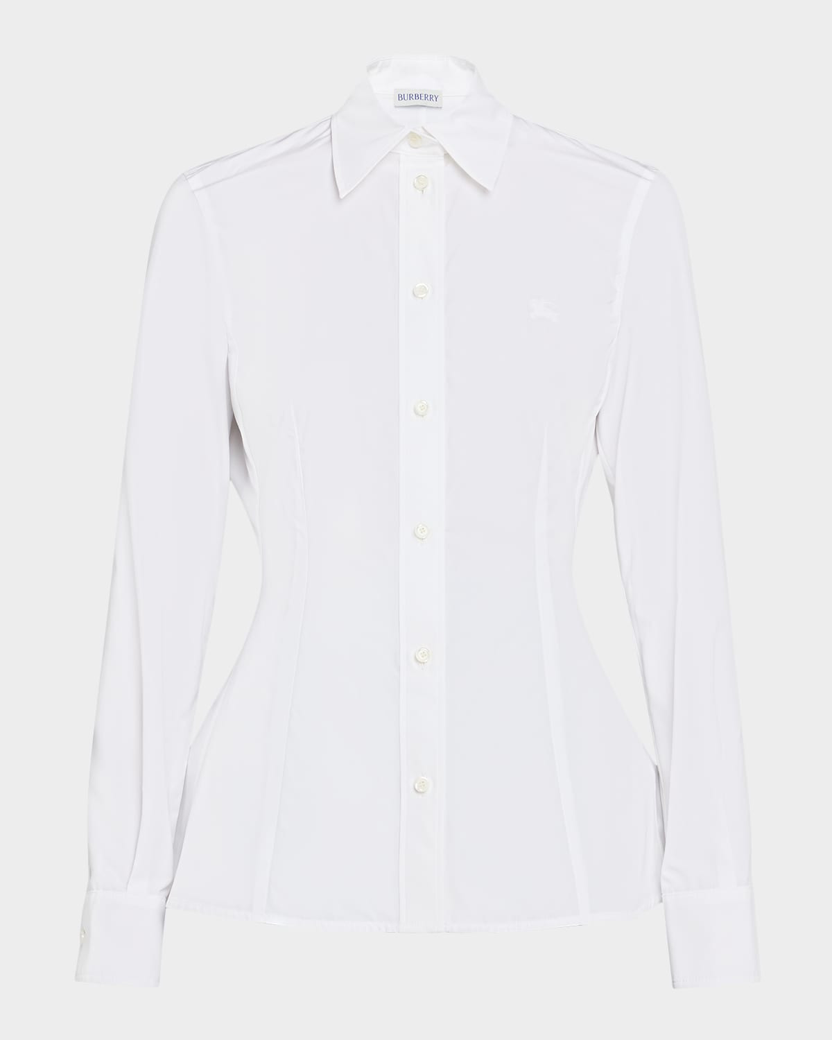Burberry "Eliza" shirt is crafted of cotton poplin, tailored with a peplum flounce hem and a signature EKD Point collar; button front Long sleeves; button cuffs Slim fit Flounce hem Cotton/motherofpearl Imported