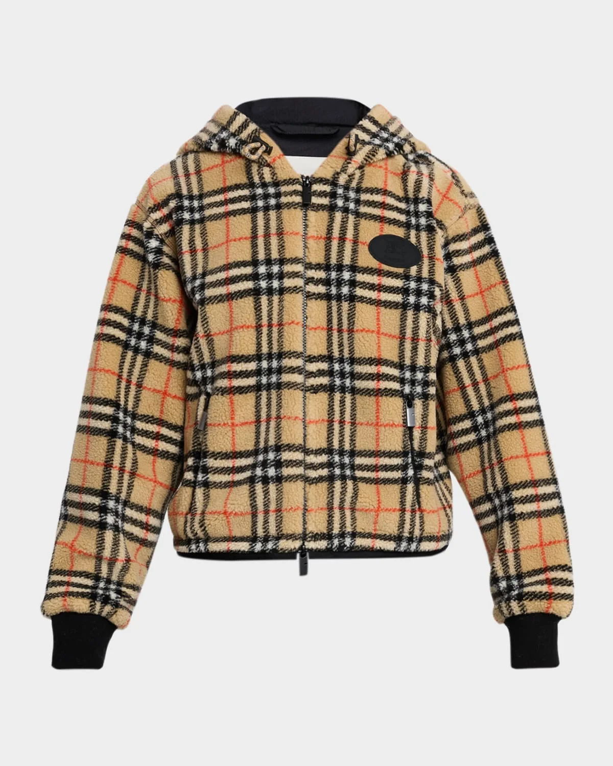 Burberry "Fiona" jacket is crafted from a signature check printed soft woolcashmere blend teddy fleece, accented with breathable mesh lining and a knight stamp chest patch Drawcord cinched hood; zip front Long sleeves; banded cuffs hip zip pockets Relaxed fit Hip length Inner drawcord cinched hem Wool/polyester/cashmere Dry clean Made in Portugal