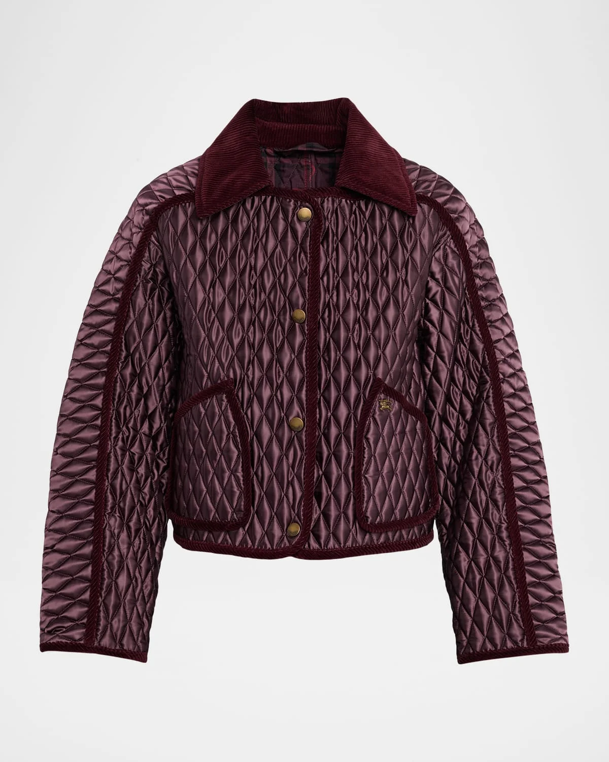 Burberry "Floriston" quilted barn jacket adorned with a soft corduroy collar and trim Spread collar; singlebreasted front Long sleeves Hip patch pockets Boxy fit Hip length Snapbutton closure Nylon/polyamide/cotton Lining: Cotton Fill: Polyester Dry clean Made in Romania
