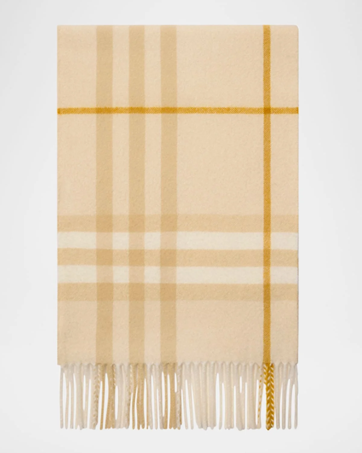 - Burberry Giant Check scarf boasts a natural luster and ultra-soft finish - Approx. 11.8"W x 66.1"L - Fringed edges - Cashmere - Professional cleaning recommended - Made in United Kingdom