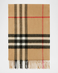 - Burberry classic check scarf made at a 200-year-old mill in the Scottish countryside. Using 30 different steps, the scarf is woven on traditional looms. The fabric is washed in local spring water and carefully brushed with teasels for a super-soft finish. - Approx. 66.1"L x 11.8"W (168 x 30cm). - May be styled multiple ways. - Fringing at both ends. - Specialist dry clean. - Cashmere. - Made in United Kingdom.