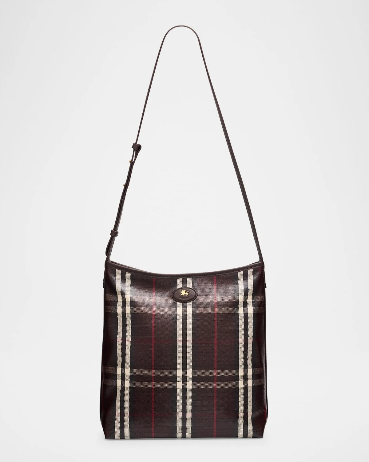 This "Highlands" shoulder bag from Burberry is crafted in a coated cottonlinen blend, jacquardwoven in the signature Check pattern Features the Equestrian Knight Design accent Adjustable shoulder strap, 13.8" 18.9" drop Zip top closure Trim: Leather Approx. 12.2"H x 11.2"W x 4.5"D Cotton/linen/viscose Made in Italy Dust bag included