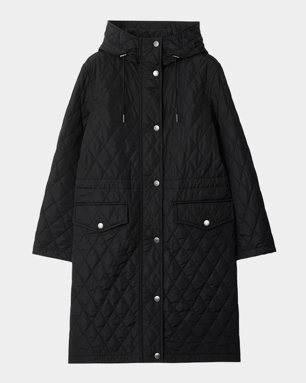- Burberry "Hillgate" quilted coat featuring signature check lining - Drawstring hooded neckline; snap-concealed zip front - Long sleeves; snap cuffs - Inner drawing cinched waist - Hip snap-flap pockets - Straight fit - Hem falls below the hip - Nylon/polyamide - Lining: Cotton - Fill: Polyester - Made in Italy