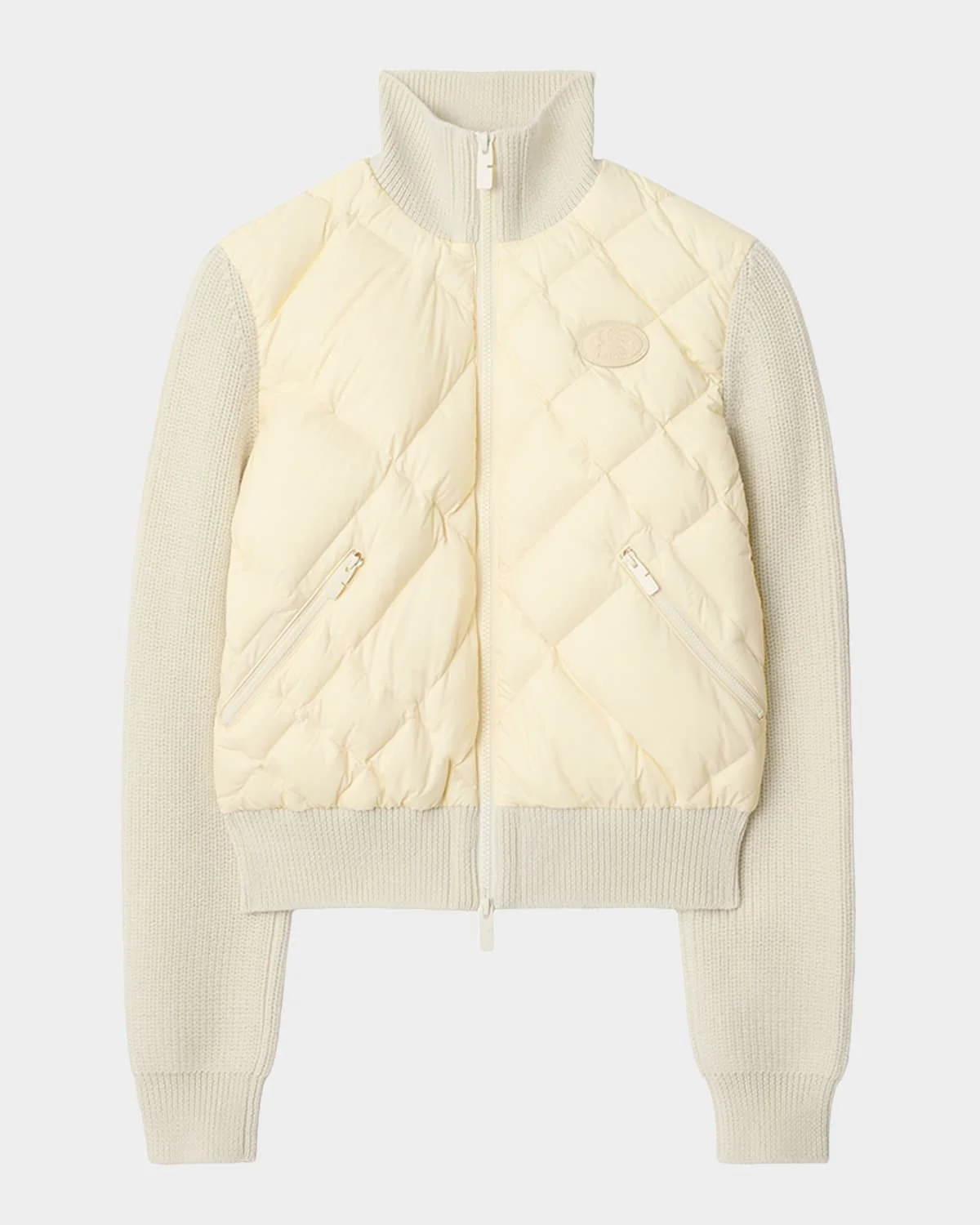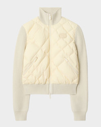 Burberry "Kelsey" jacket is crafted of a quilted nylon bodice with wool knit sleeves combo adorned with a signature EKD logo embossed leather patch on the chest Stand collar; twoway zip front Long sleeves Hip zip pockets Slim fit Hip length Ribbed cuffs and hem Nylon/polyamide/wool/elastane Lining: Nylon Fill: Polyester, feather/down Trim: Leather Machine wash Imported
