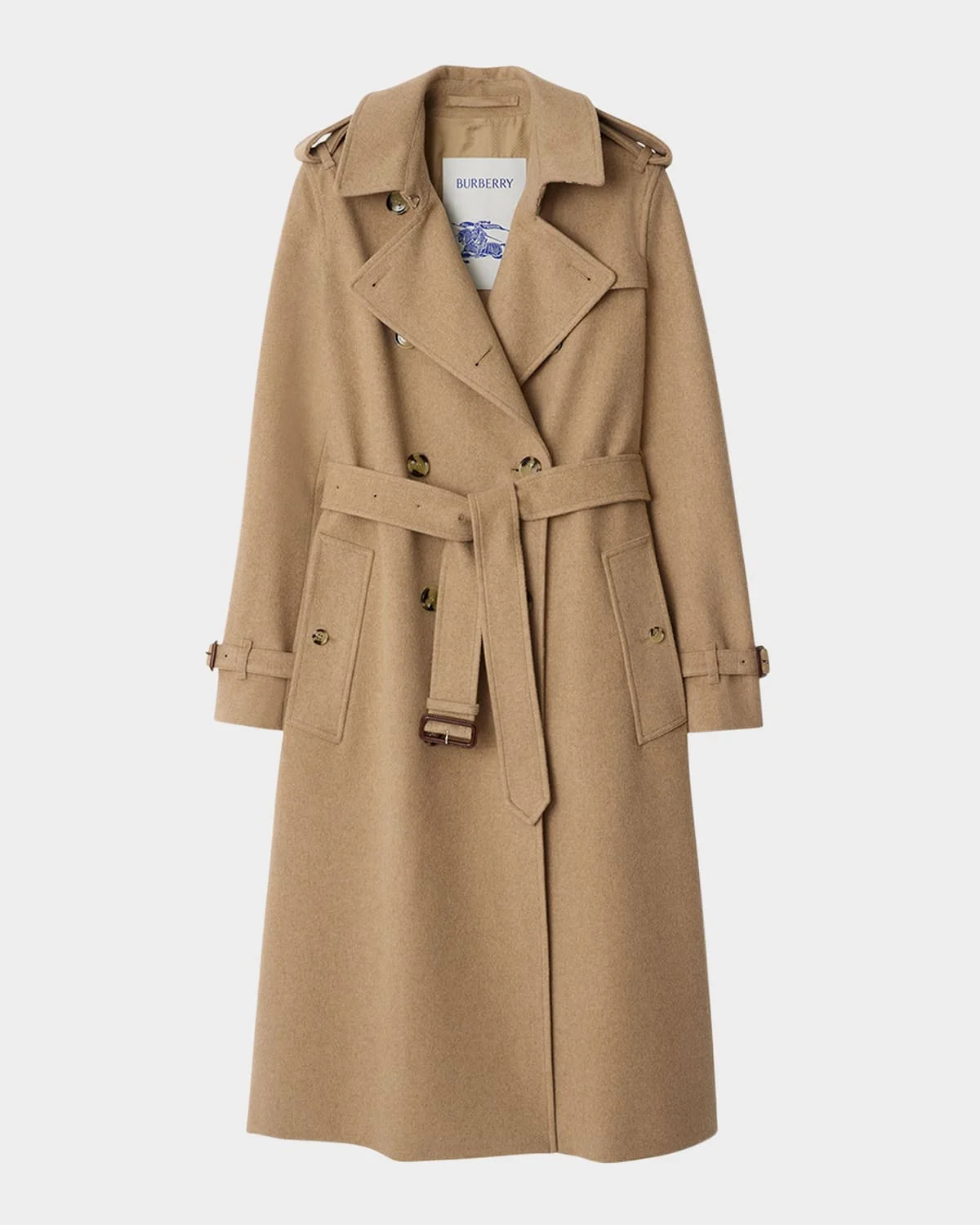 - Burberry "Kensington" brushed cashmere-blend trench coat with shoulder epaulets, a self-belt, and calf leather trim - Trench collar with throat latch; double-breasted front - Long sleeves; belted cuffs - Chest gun flap - Hip button-welt pockets - Straight fit - Hem falls below the knee - Walking vent back - Cashmere/wool/cotton - Lining: Cupro - Machine wash, wash inside out - Made in Italy