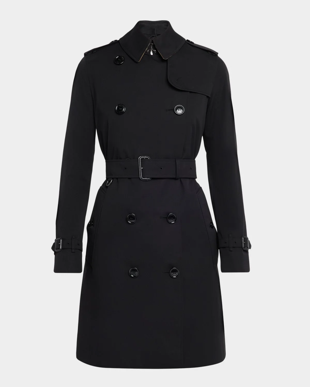Burberry "Kensington" trench coat with check lining Trench collar with check undercollar and throat latch Doublebreasted button front Long sleeves; belted cuffs Waist belt Buttonthrough hip pockets Epaulets; gun flap; rain shield Walking vent Classic fit Cotton Lining: Viscose/cotton Dry clean Imported