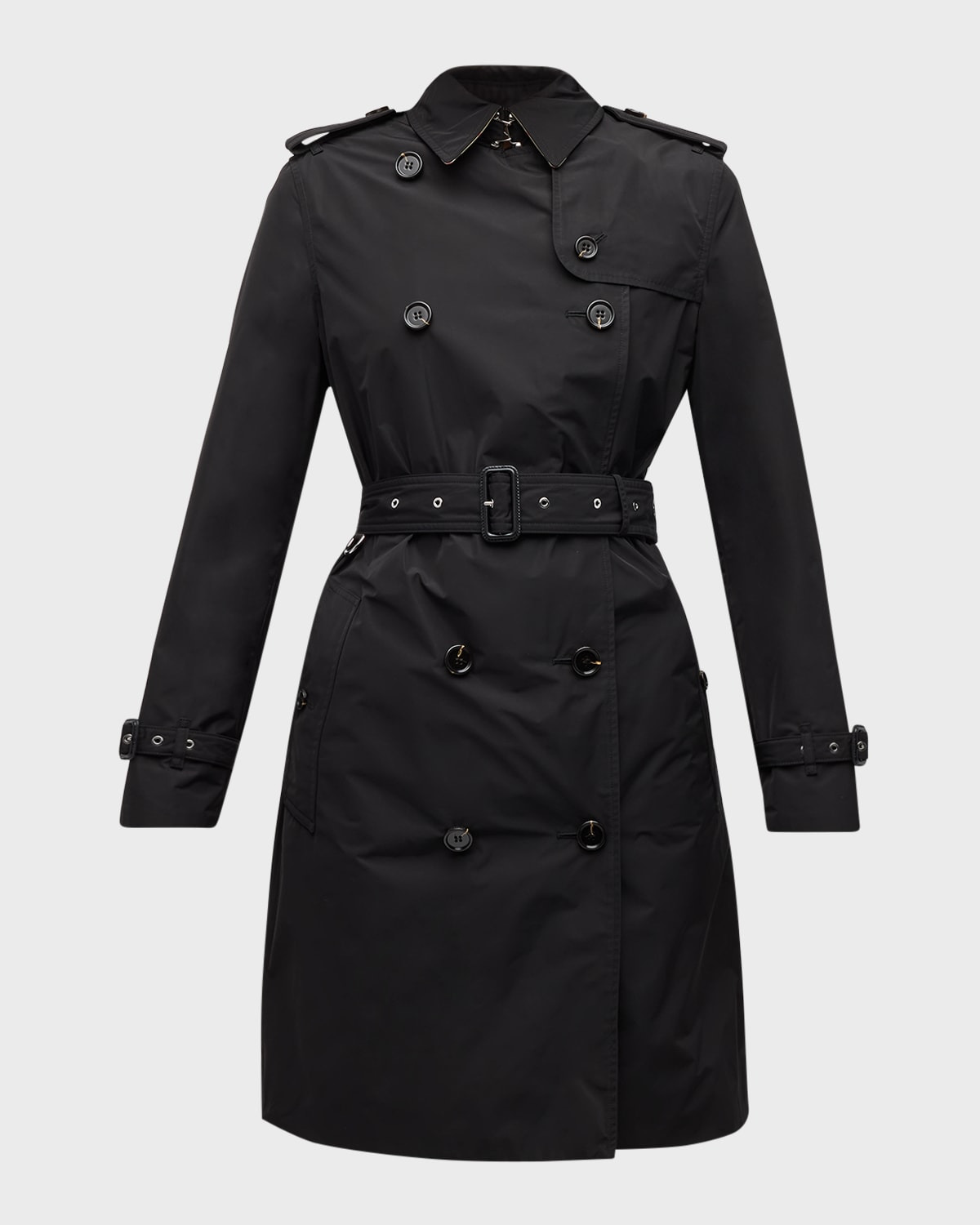- Burberry "Kensington" fit trench coat in taffeta - Spread collar with throat latch - Approx. 37.4"L from shoulder to hem - Double-breasted button front - Long sleeves; belted cuffs - Adjustable self-belt may be tied, buckled, or removed - Button-through pocket detail - Relaxed fit - Polyester, self/lining - Machine wash - Imported - Size Note: Height: 5'11"/ waist 24”/ hips 35"/ bust 30" - Model is wearing size 4