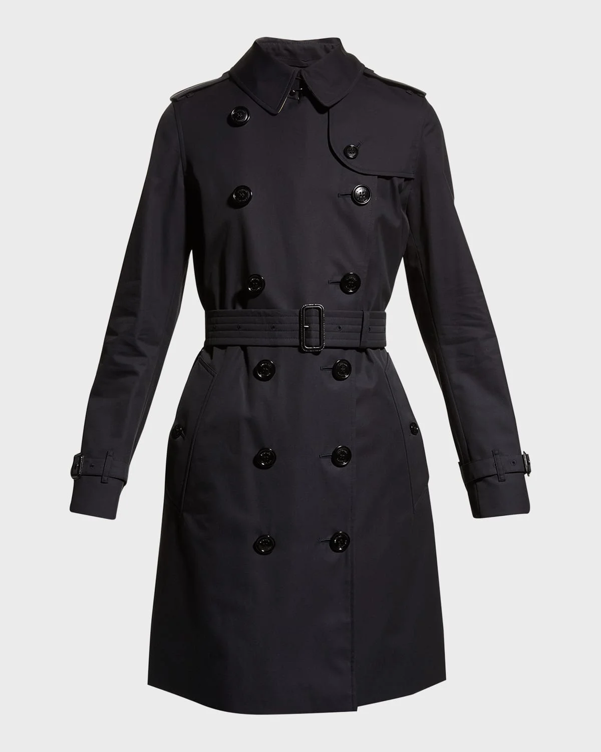 Burberry "Kensington" trench coat in gabardine with check lining. From the Heritage Collection. Approx. 36"L down center back. Trench collar with check undercollar and throat latch. Double-breasted button front. Long sleeves; belted cuffs. D-ring self-belt; leather buckle. Button-through hip pockets. Epaulets; gun flap; rain shield. Walking vent. Classic fit. Cotton. Dry clean. Made in England. Model is 5 & apos;10"/177cm.