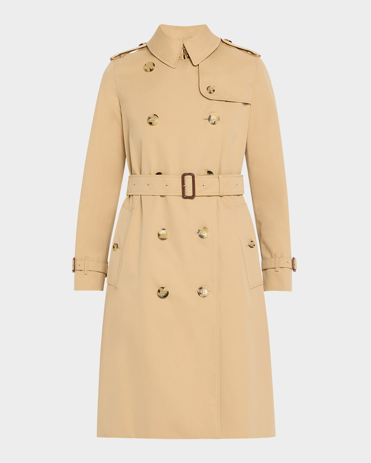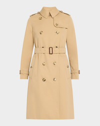 Burberry "Kensington" organic waterresistant gabardine trench coat featuring signature check lining and undercollar Trench collar with throat latch; doublebreasted front Long sleeves; belted cuffs Chest gun flap; back rain shield Belted waist Shoulder epaulets Side flap pockets Straight fit Hem falls below the knee Centerback vented hem Organic cotton Made in United Kingdom