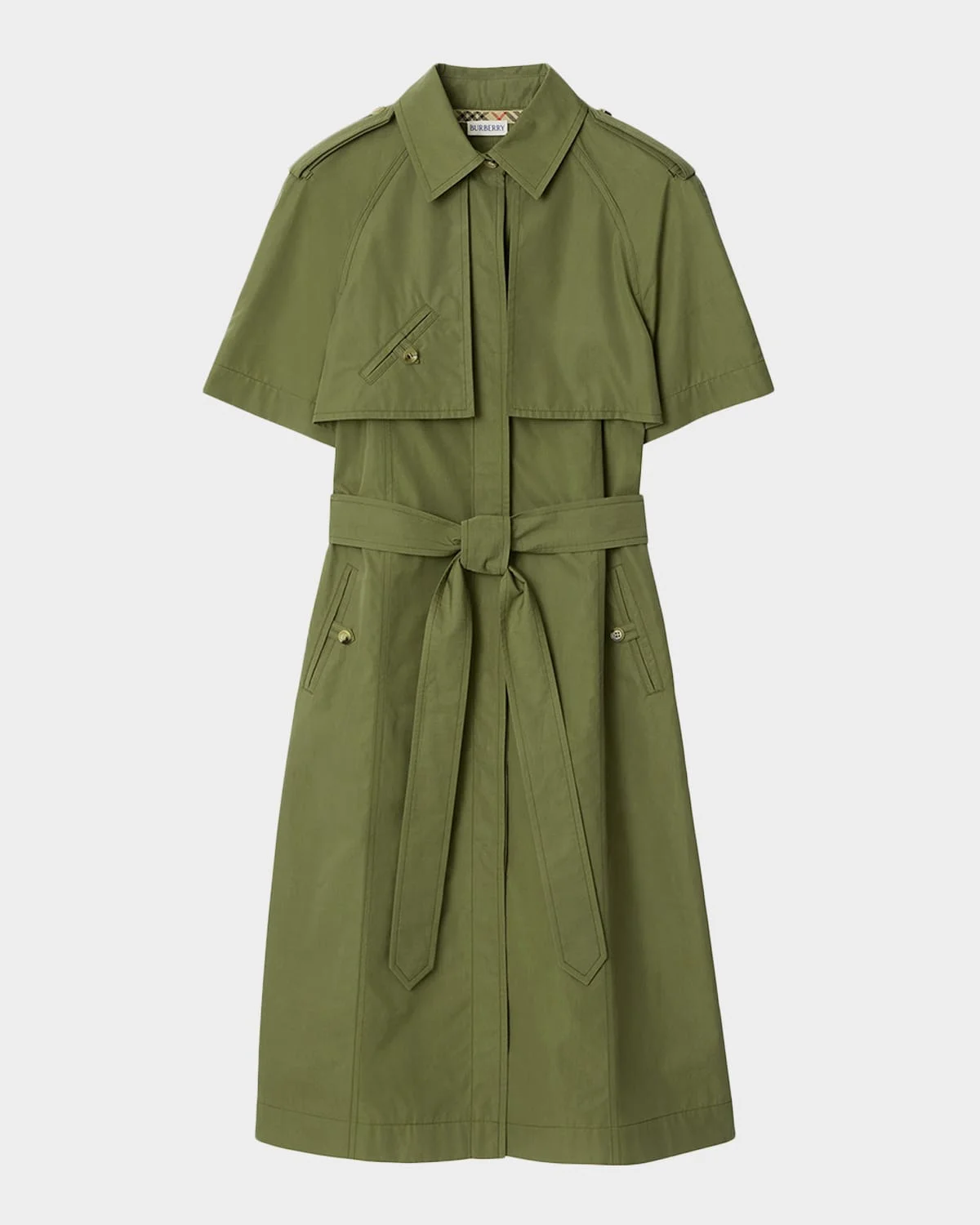 Burberry "Marina" shirtdress made from cotton poplin reworking signature details from our iconic trench, the belted style is trimmed with burberry check taping in signature sand beige. Point collar; concealed button front Short raglan sleeves Shoulder epaulets Dual gun flaps; rain shield back Chest buttonwelt pocket Selftie belted waist Hip buttonwelt pockets Aline silhouette Knee length Cotton/horn Lining: Cotton Machine wash, dry clean Made in United Kingdom