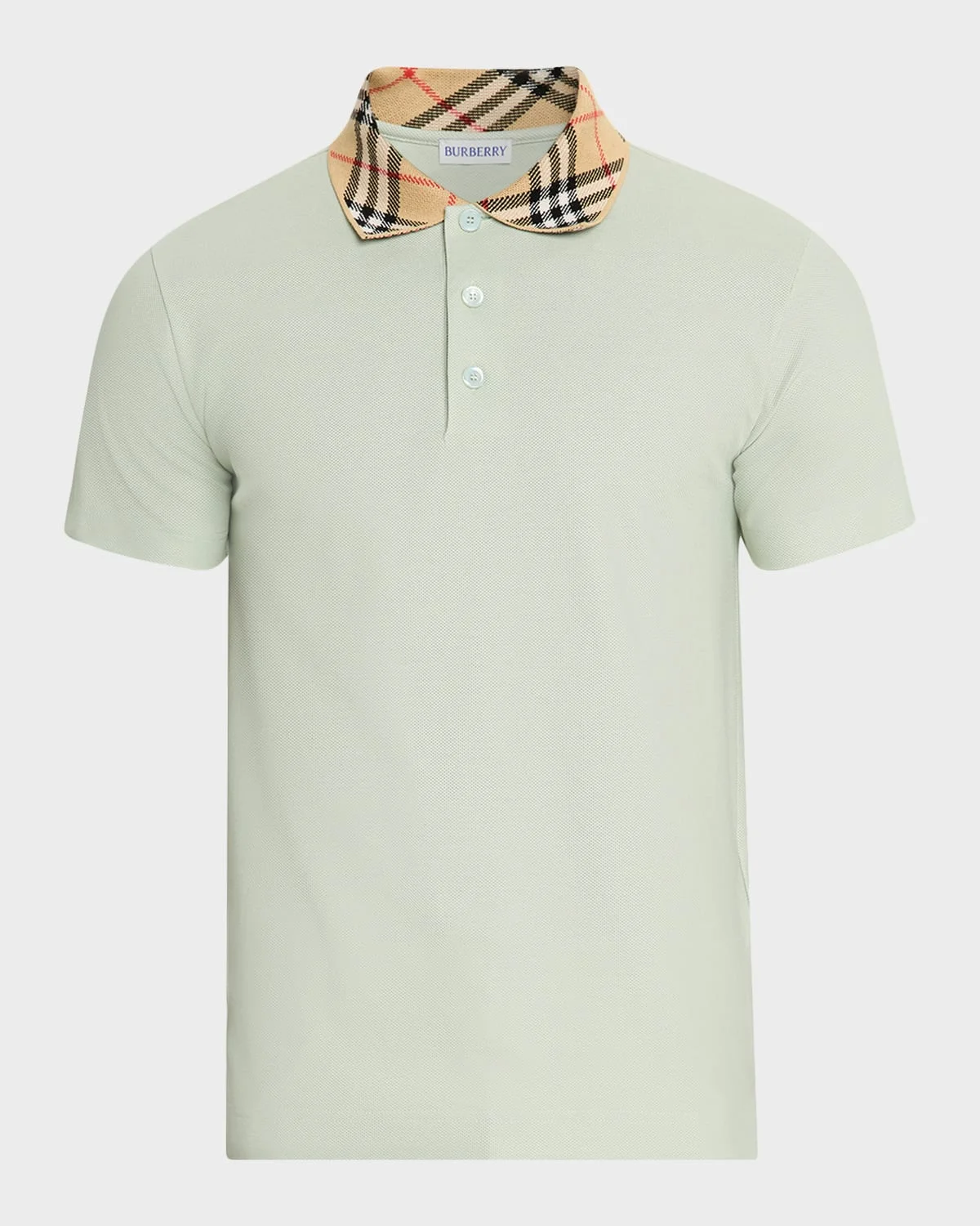 This Burberry polo shirt is crafted in lightweight cotton pique, knitted with the iconic Check on the collar. Ribknit collar Threebutton placket Vented sides Pullover style Slim fit Cotton Machine wash warm dry flat, wash inside out Made in Portugal