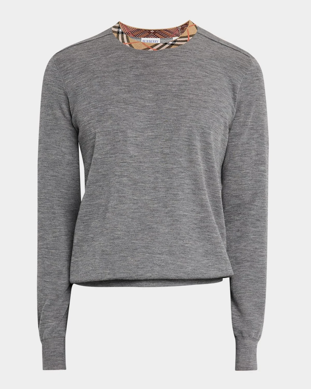 - Burberry wool knit sweater enhanced with signature check trim - Crew neckline - Long sleeves - Classic fit - Pullover style - Wool - Dry clean - Made in Italy