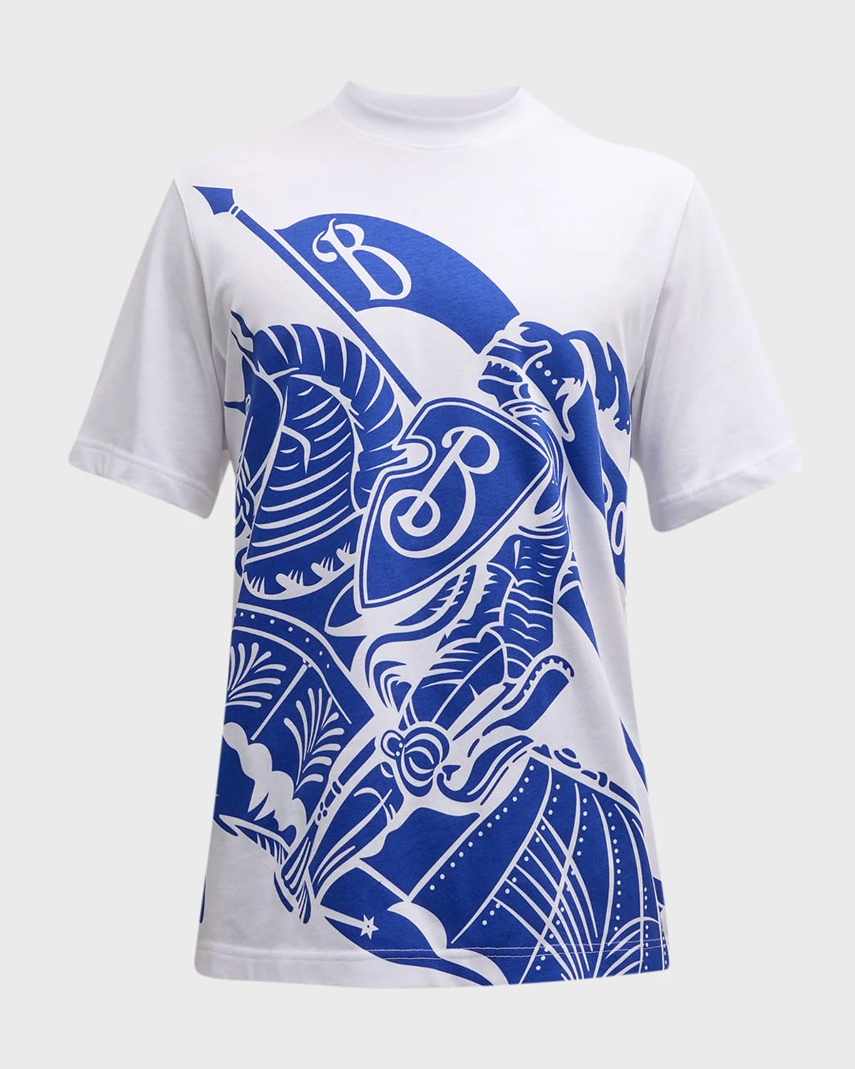 - Burberry T-shirt with signature Equestrian Knight Device print at front - Crew neckline - Short sleeves - Pullover style - Cotton - Made in Portugal - Model is 6'1"/185cm.