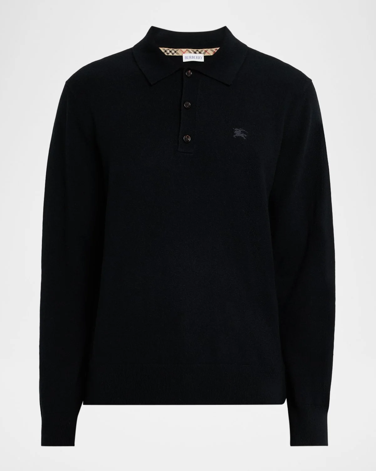 - Burberry soft knit polo sweater in a luxurious cashmere blend, defined by an embroidered Equestrian Knight Design on the chest - Spread collar - Three-button placket - Long sleeves - Ribbed cuffs and hem - Pullover style - Cashmere/nylon/polyamide/elastane - Dry clean - Imported