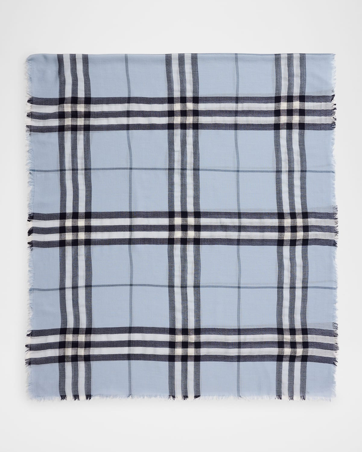 - Burberry lightweight wool blend scarf in signature giant check - Approx. 78.7"L x 35"W - May be styled in multiple ways - Eyelash fringe ends - Wool - Professional cleaning recommended - Made in Italy