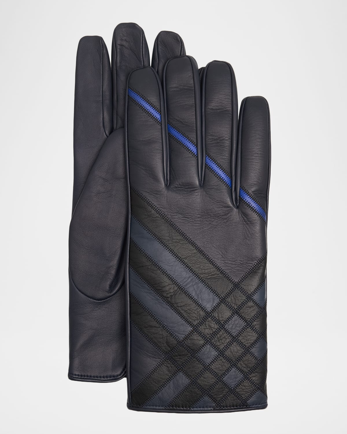 Burberry gloves crafted of leather panels, intricately cut and handstitched to form an intarsia check pattern Leather/silk Lining: Cashmere Professional cleaning recommended Made in Italy