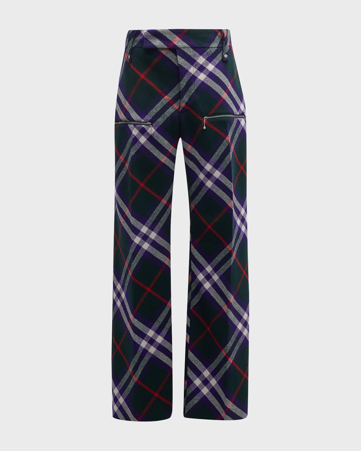 - Burberry pants in multicolor check - Mid rise - Side slant pockets - Zip pockets at front legs - Full length - Straight legs - Virgin wool - Lining: Cupro/viscose - Made in Italy - Model is 6'1"/185cm.