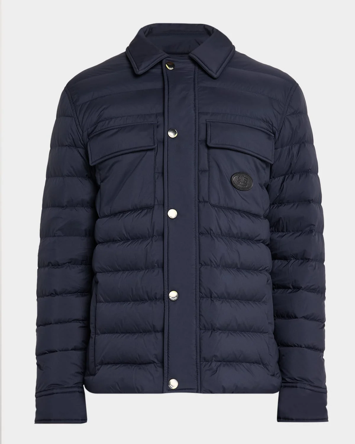 This Burberry nylon overshirt is padded with goose down and feathers, finished with the Knight stamp, an archival motif first used in the 1980s. Twoway zip front Snap fastenings Chest flap snap pockets Side zip pockets Snap cuffs Leather chest patch with Equestrian Knight Design Classic fit Nylon/polyamide Machine wash Imported