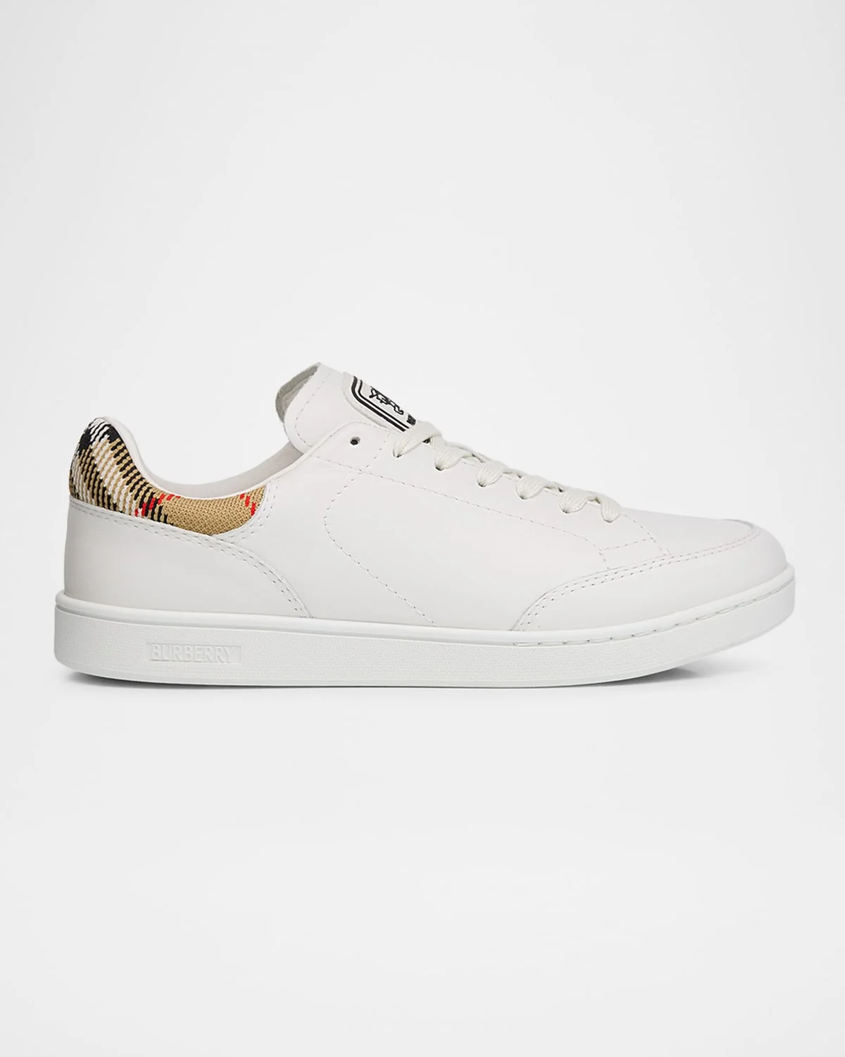 Burberry's new signature sneaker, the "Set" is a minimalist style designed for everyday luxury. The lowtop shape is crafted from smooth leather and finished with a knit nylon cuff in the signature Burberry Check. Flat heel Round toe Laceup vamp Padded collar for comfort Suede Equestrian Knight badge on the tongue Rubber outsole with Equestrian Knight design Lining: Leather Comes with a dust bag Spot clean Made in Italy