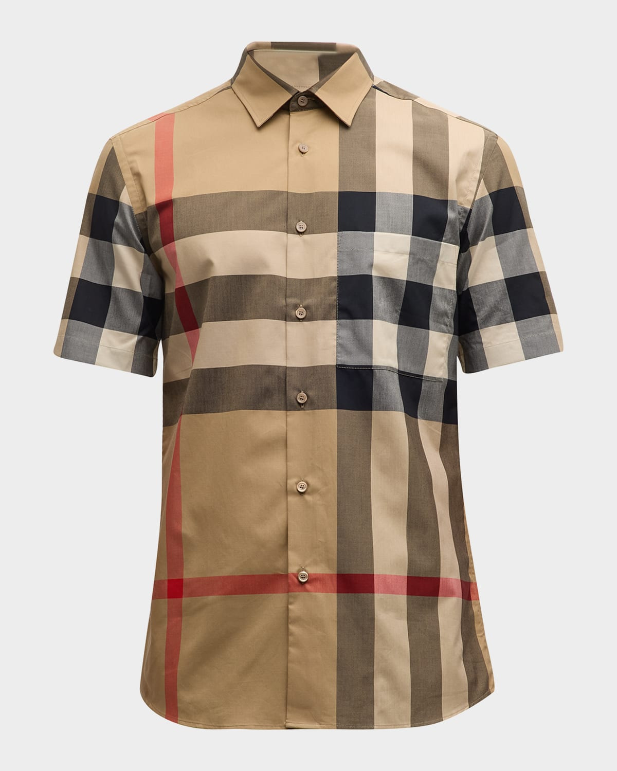 - Burberry "Summerton" sport shirt in signature check print - Point collar; button placket - Chest patch pocket - Short sleeves - Cotton - Imported - Model is 6'1"/185cm.